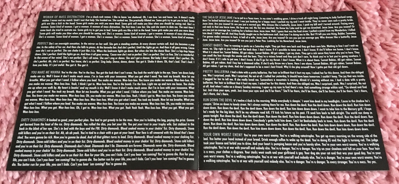The 18-page booklet contains abridged material from the original album releases and includes track listings, lyrics and credits. Oddly, each album is oriented a different way, which means that the cover of Dirty Diamonds is upside down inside the case and that the images where the two booklets meet in the centre are also displayed in opposite directions.