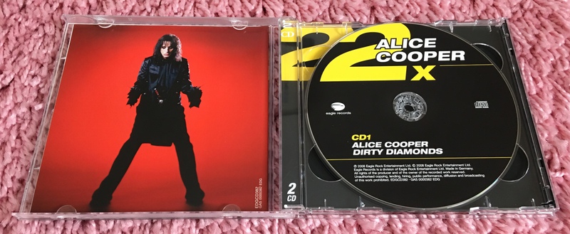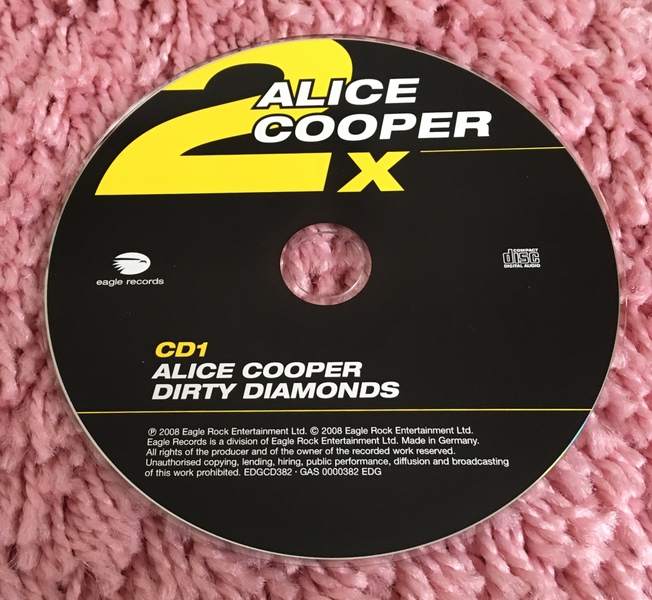 This European compilation CD originally retailed for about £5 and features the full Dirty Diamonds (including Stand) and The Eyes Of Alice Cooperalbums on two separate discs, housed in a clear jewel case. A simple paper inlay is provided, containing track listings and credits for both albums plus an image of Alice from the original Dirty Diamonds album booklet.