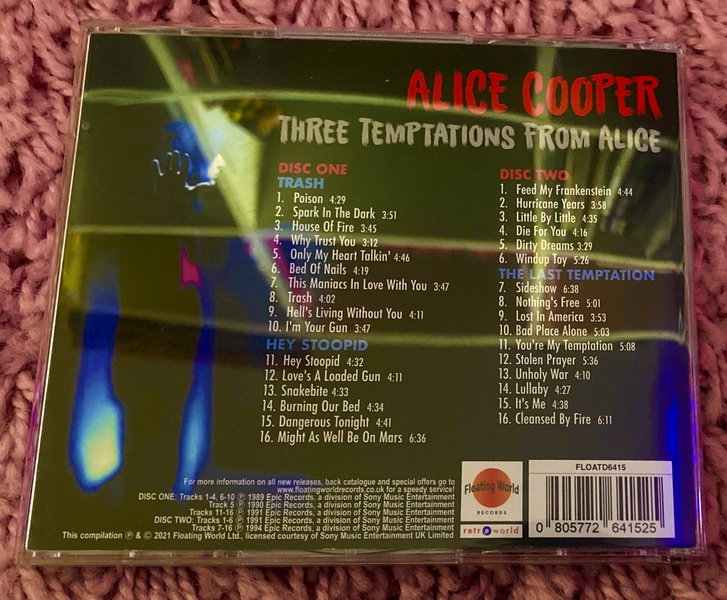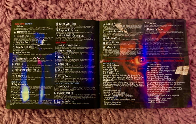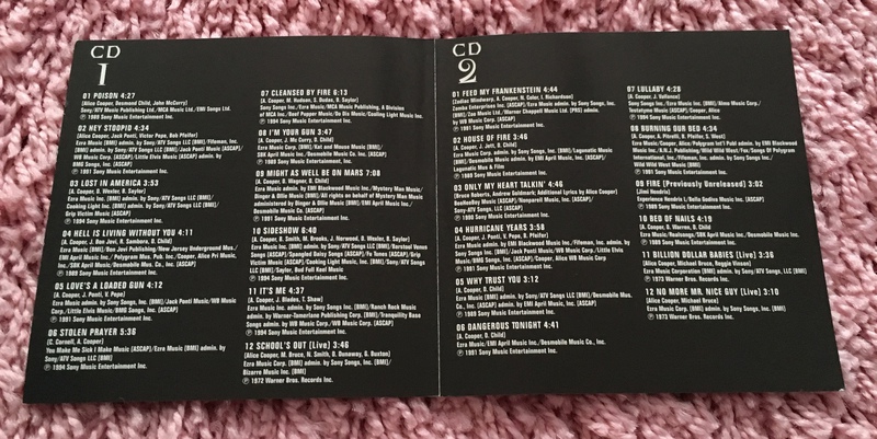 This European compilation CD features two discs and includes tracks from the Sony catalogue of Alice Cooper albums Trash (seven tracks), Hey Stoopid (seven tracks) and The Last Temptation (seven tracks). Rather than listing the tracks that are included, it's easier to simply state the ones that DO NOT feature. These are Spark In The Dark, This Maniac's In Love With You and Trash (Trash), Snakebite, Little By Little, Die For You, Dirty Dreams and Wind-Up Toy (Hey Stoopid) and Why Trust You and This Maniac's In Love With You (Trash) and Nothing's Free, Bad Place Alone, You're My Temptation and Unholy War (The Last Temptation).