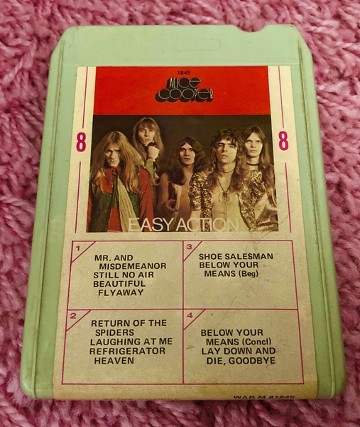 This very rare USA 1st edition 8-Track album features a yellow cartridge and, interestingly, includes the artwork from the rear of the vinyl album on the front. One can only assume that with space for just one image, a decision was taken that the faces of the Alice Cooper Group had to take priority. A further wrap-around sticker provides track listings, the product code and confirms that this release was distributed by Warner Brothers.