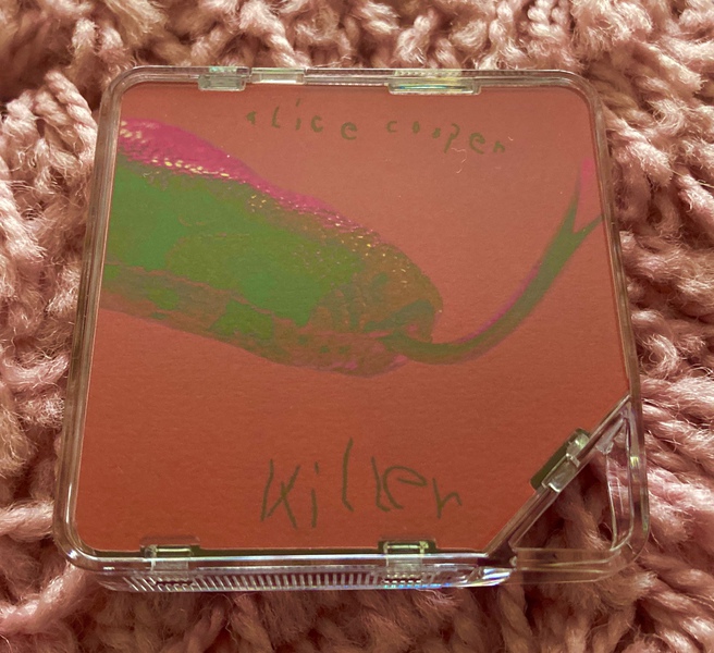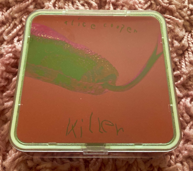 This USA 12" promotional vinyl album features a menacing close-up image of Neal Smith's pet snake Kachina. The front cover is especially notable as 'Alice Cooper' and 'Killer' are scrawled by the left (i.e. wrong) hand of Dennis Dunaway himself. The reason for this is that Alice and Dennis wanted the writing to look like the hand of a serial killer, and Dennis was more than happy to play that role (which he pulls off very well)!