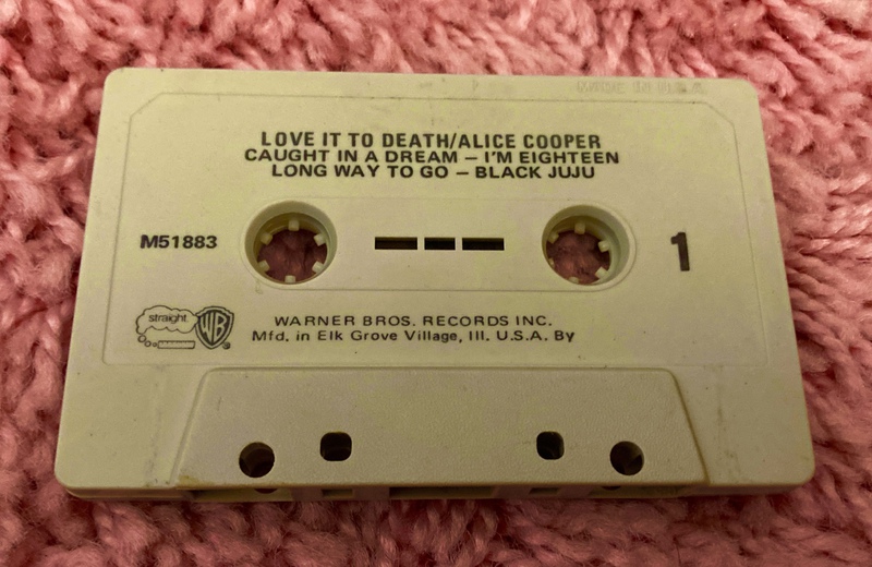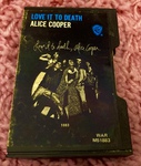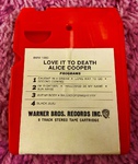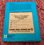 This UK cassette of Love It To Death features a simple J-card containing abridged artwork, track listings and credits. Inside is a black tape with stickers providing additional track listings. Alice's thumb and forearm are airbrushed off the front cover.