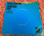 This very rare Italian 7" vinyl single features green Warner Brothers labels, comes in a paper sleeve, and includes Eighteen on Side A and Body on Side B (both from the Love It To Death album). Unlike other versions of this single, the tracks are titled '(I'm) Eighteen' and '(Is It My) Body' on the vinyl labels, making them similar to the original titles used on Love It To Death. The abbreviated titles are still used on the sleeve, however.