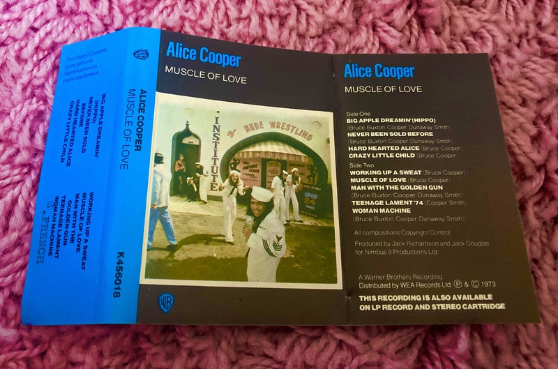 This UK 1st edition cassette version of Muscle Of Love includes a basic J-Card featuring abridged artwork and track listings. As with the Australian cassette version (above), the image included on the front is the one of the Alice Cooper Group dressed as sailors, which originally featured on the inner sleeve of the vinyl release.