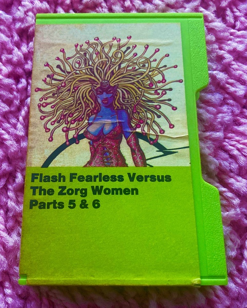 This USA first edition cassette version of Flash Fearless Versus The Zorg Women Parts 5 & 6 comes in a fetching green plastic 'Slipcase' with abridged artwork and matching green tape.