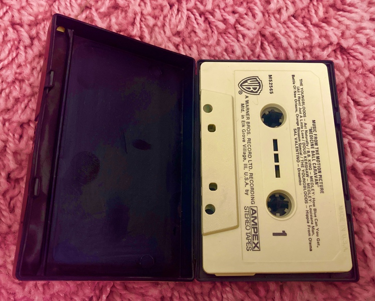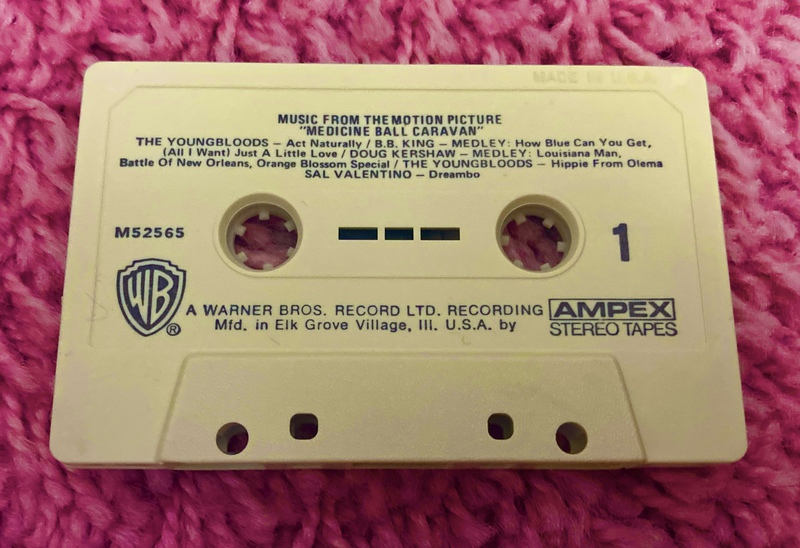This USA first edition cassette version of Medicine Ball Caravan features a black 'Snapcase' box with wraparound paper cover with abridged artwork and track listings. The white cassette also includes the track listings.