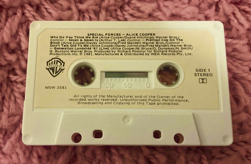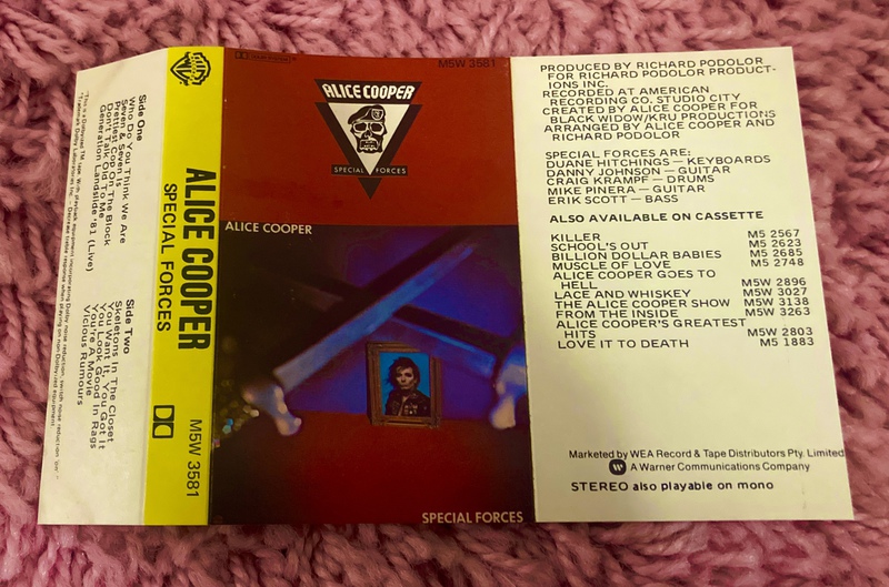 This Australian cassette version of Special Forces features a simple, single-sided, J-card containing abridged artwork, track listings, credits and promotional material for other Alice Cooper releases. Inside is a white tape with cream labels providing additional track listings and credits.
