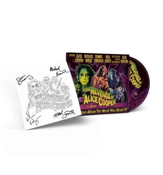 This European 'Special Signed Edition' CD version of The Revenge Of Alice Cooper is exactly the same as the standard version (above) only that it features a 5" x 5" insert autographed by Alice, Dennis, Mike and Neal, an additional hype sticker and a different barcode on the back (stuck over the original one).