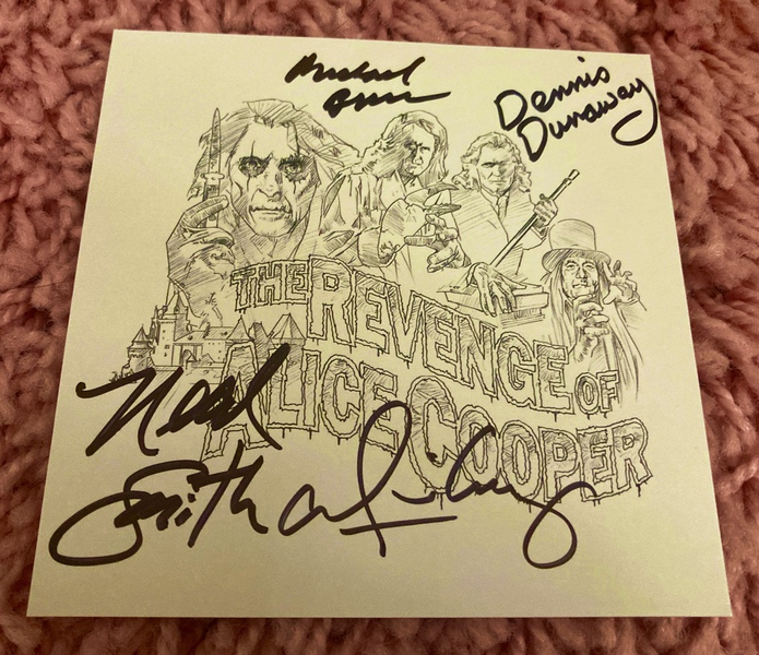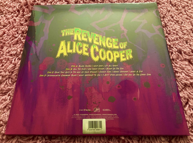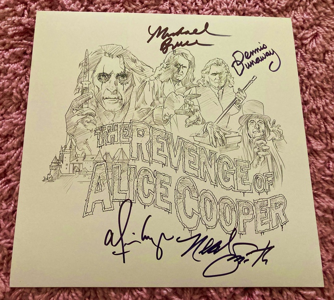This further European 12" vinyl version of The Revenge Of Alice Cooper, sold by HMV UK, is exactly the same as the above version only that it includes the insert autographed by Alice, Dennis, Mike and Neal originally offered with the violet version in the USA by TalkShop.Live. The big advantage of this version, however, is that the insert was free!
