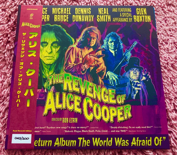 This custom 'Assai Records Edition' European 12" vinyl version of The Revenge Of Alice Cooper was limited to 200 individually numbered copies (of which this is #043). It is exactly the same as the Violet Edition (above) only that it features a bespoke Obi strip that closely resembles that of the Japanese CD version (below).