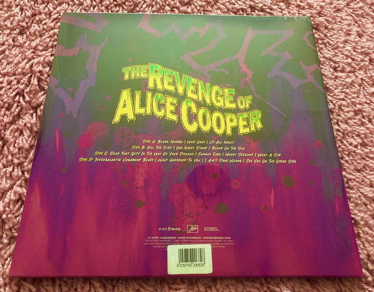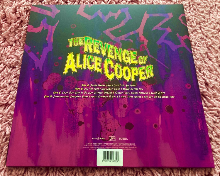 This 'Limited' European 12" vinyl version of The Revenge Of Alice Cooper is exactly the same as the black vinyl version (above) only that it features two semi-translucent 'Violet Marbled' 45 RPM, 180 gram, discs, an alternative hype sticker and includes a different barcode on the back (stuck over the original one).