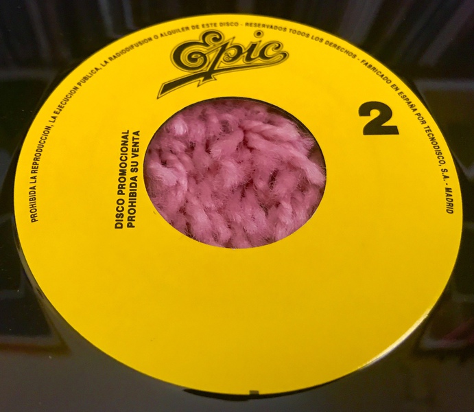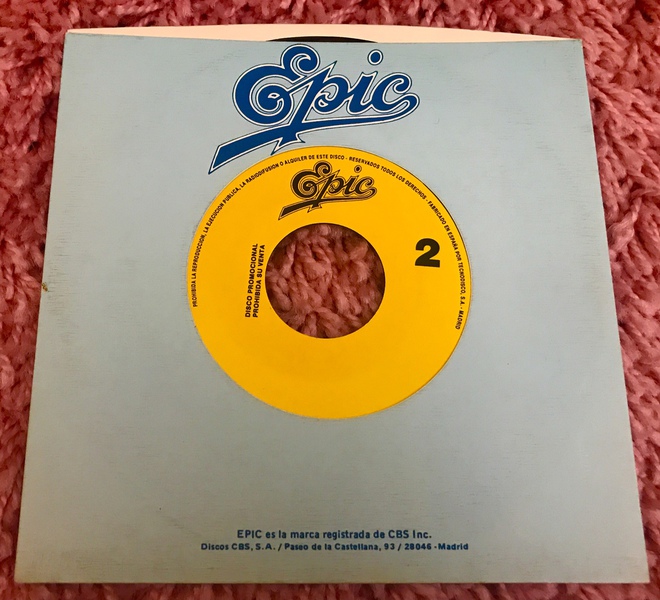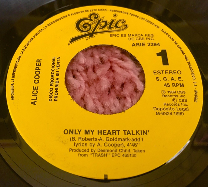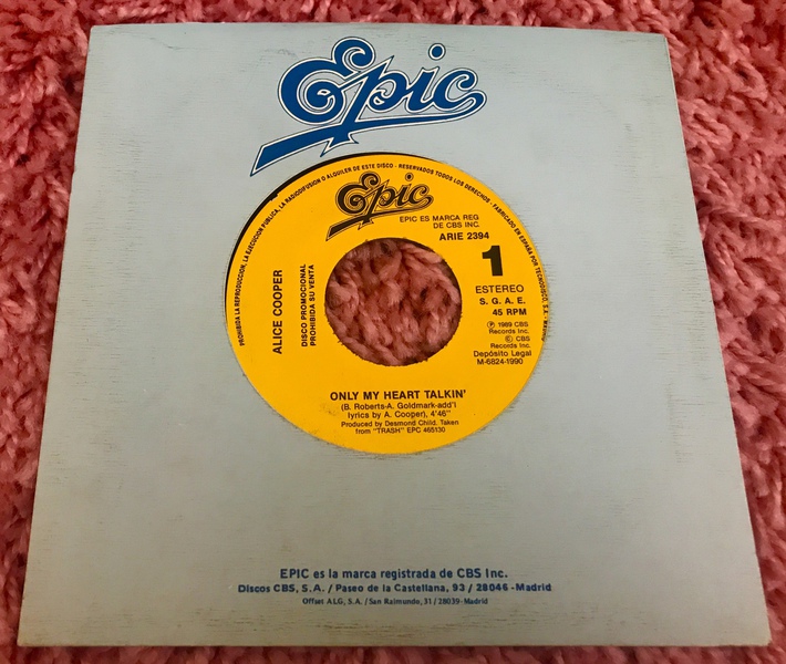 This Spanish 7" promotional vinyl single features unique yellow Epic labels, comes in a generic card sleeve, and includes Only My Heart Talkin' on Side A (from the Trash album). Side B is uncut, with the label left blank. The vinyl labels state 'DISCO PROMOCIONAL PROHIBIDA SU VENTA' (i.e. 'PROMOTIONAL DISC FORBIDDEN FOR SALE').