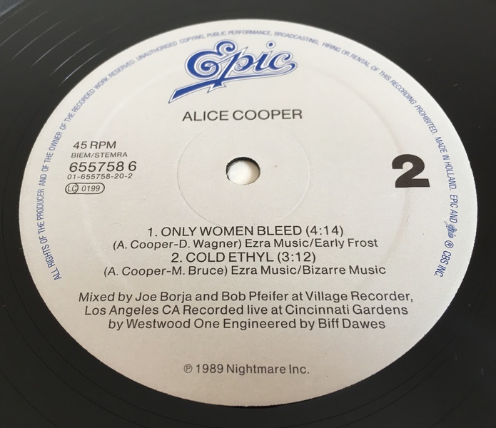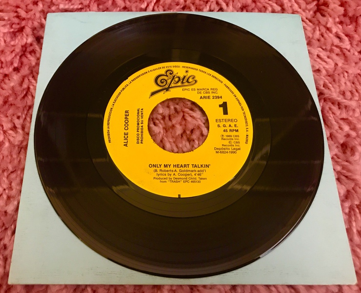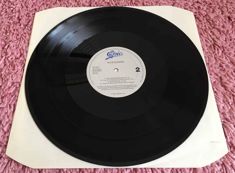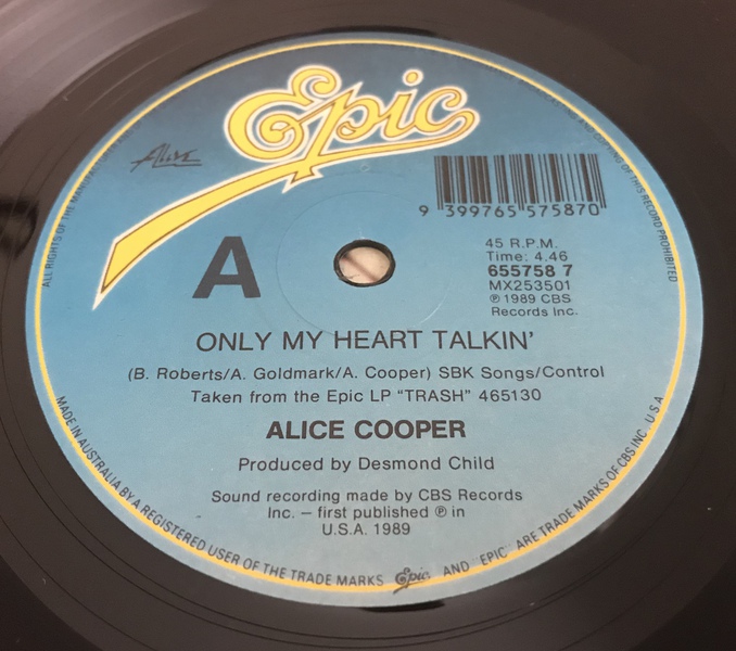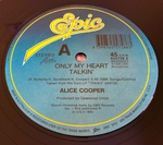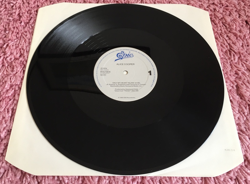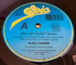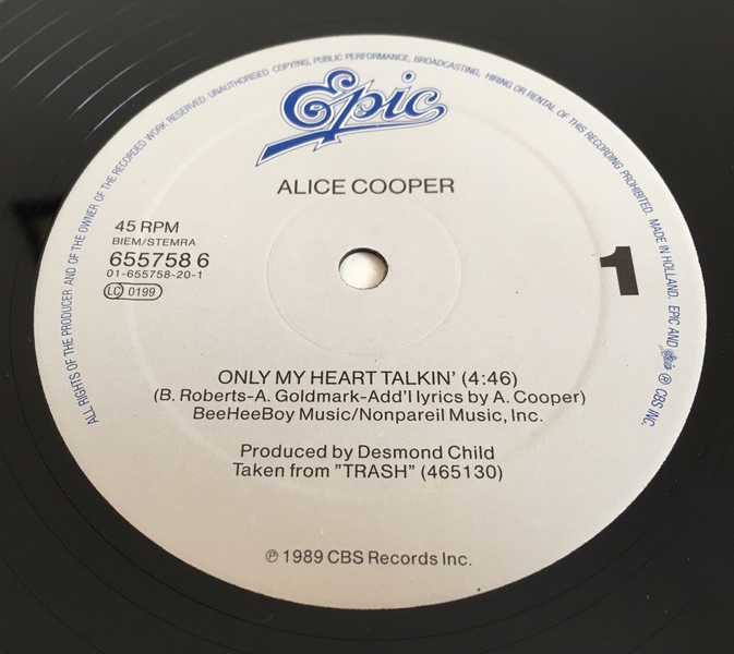 This European 12" vinyl single features white Epic labels, comes in a simple card sleeve, and includes Only My Heart Talkin' on Side A (from the Trash album) and live versions of Only Women Bleed and Cold Ethyl on Side B (recorded at Cincinnati Gardens in 1987).