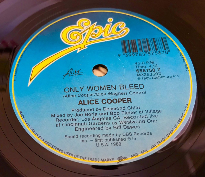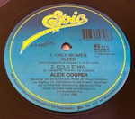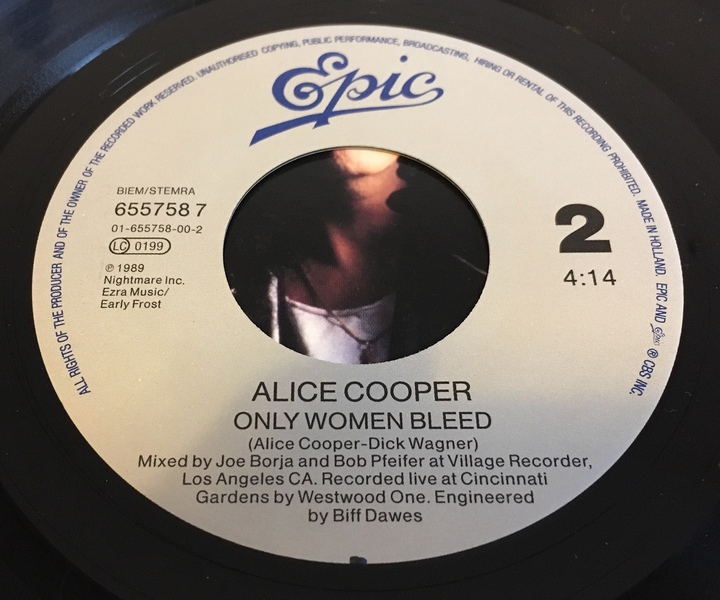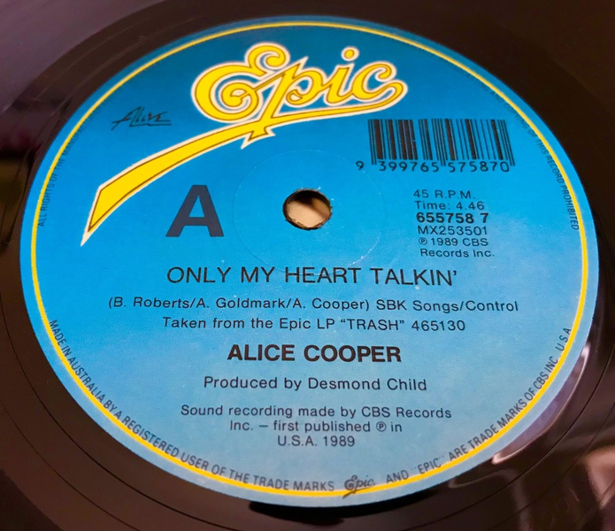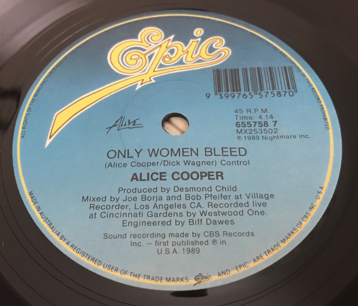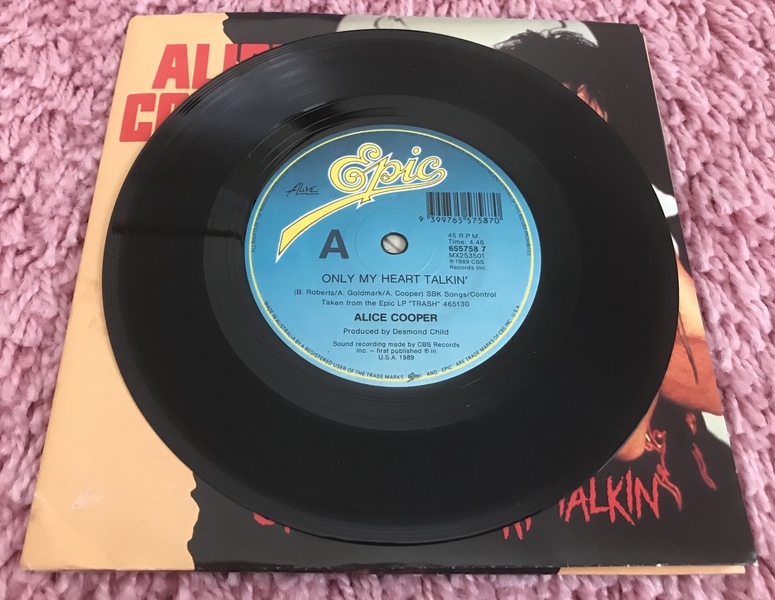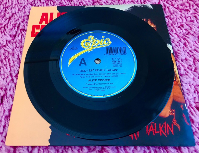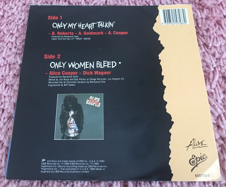 This European 7" vinyl single features white Epic labels, comes in a simple card sleeve, and includes Only My Heart Talkin' on Side A (from the Trash album) and a live version of Only Women Bleed on Side B (recorded at Cincinnati Gardens in 1987).