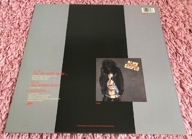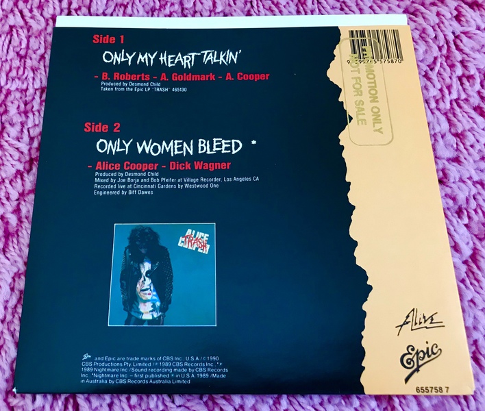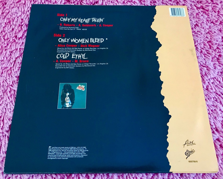 This Australian 12" vinyl single features blue Epic labels, comes in a simple card sleeve, and includes Only My Heart Talkin' on Side A (from the Trash album) and live versions of Only Women Bleed and Cold Ethyl on Side B (recorded at Cincinnati Gardens in 1987). The sleeve features near identical artwork as the 7" single (above).