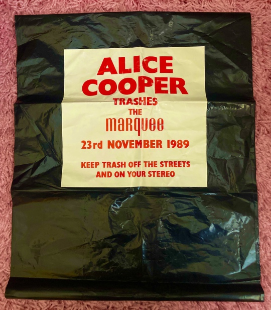 On the 23rd November 1989, a unique event was held at the Marquee Club in London to promote the Trash album (which had been released a few months earlier). This involved Alice performing a 13-track setlist (including six songs from the new album) plus some garbage-related exploits whereby fans were handed out branded bags, asked to fill them with rubbish, and then chuck them into a trash lorry before they were allowed to enter.