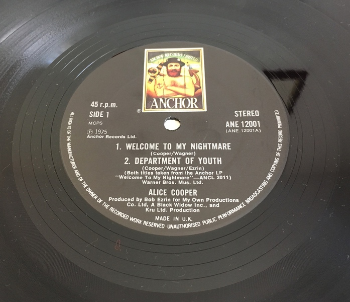 The UK 1st pressing of Welcome To My Nightmare is nearly identical to the USA version (above) only that it features black Anchor Records labels (who pressed the album in Europe and other territories).
