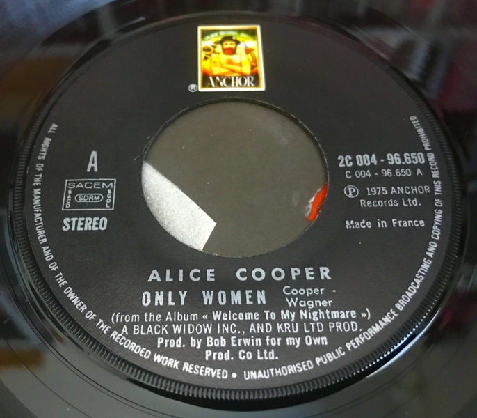 This French 7" vinyl single features black Anchor Records labels, a paper sleeve and includes Only Women Bleed (abbreviated to 'Only Women') on Side A and Devil's Food on Side B (both from the Welcome To My Nightmare album).