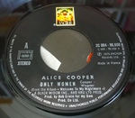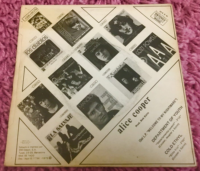As with the Spanish version of this single (above) the front of the sleeve features images of Alice and a top hot from the inner sleeve of the Welcome To My Nightmare vinyl album (above). On the back is promotional material for other artists of the time.