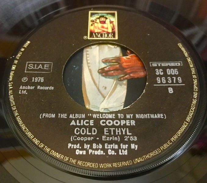 This Italian 7" vinyl single features black Anchor Records labels, comes in a paper sleeve and includes Department Of Youth on Side A and Cold Ethyl on Side B (both from the Welcome To My Nightmare album).