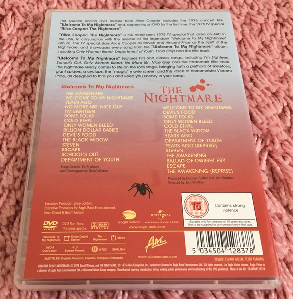In 1975, a TV special called 'The Nightmare' aired on USA channel ABC. Starring Alice as Steven and Vincent Price as 'The Spirit', The Nightmare was a full blown concept film that featured alternative (and out-of-sequence) versions of every track from the Welcome To My Nightmare album plus Ballad Of Dwight Fry (from the Love It To Death album). A number of interludes add further context to Steven's nightmare and help tie the storyline together well.