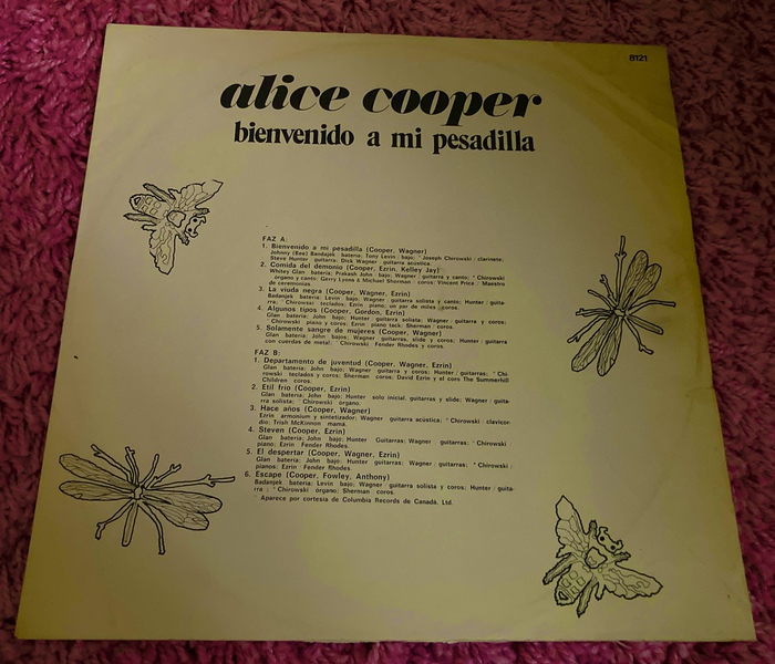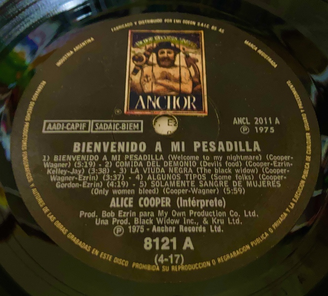 This Argentine 1st pressing of Bienvenido A Mi Pesadilla (i.e. Welcome To My Nightmare) comes in a simple card sleeve with unique Spanish text artwork and features black Anchor Records labels with bilingual Spanish / English track listings. The rear of the sleeve is almost identical to the USA and UK version (above) only that the track listings are again presented in both Spanish and English.