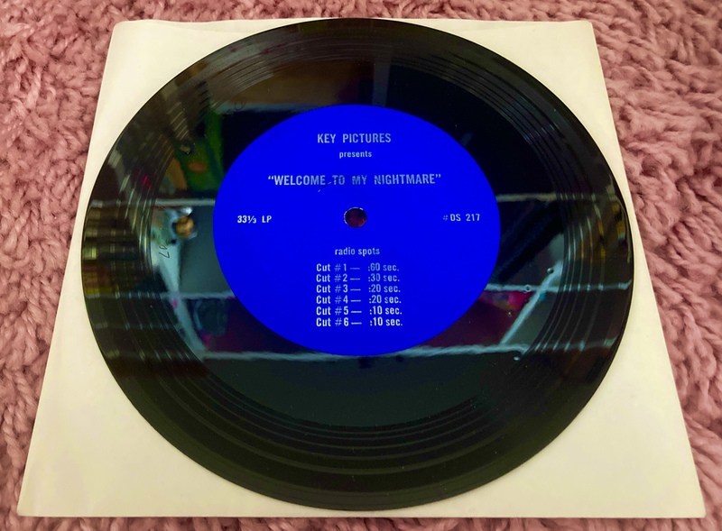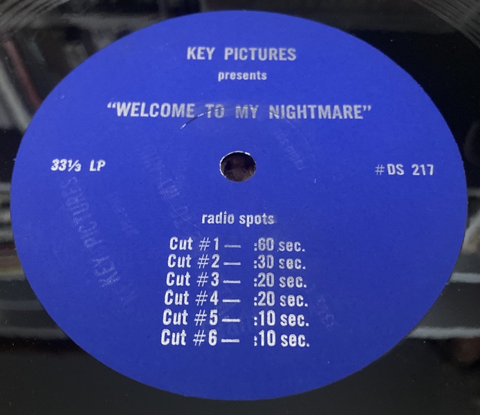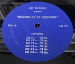 This rare USA single-sided 7" promotional vinyl features a blue Key Pictures label and includes six 'Radio Spots', of varying length, for the Welcome To My Nightmare concert film. Radio Spots were basically audio adverts that were given to radio stations by music labels in order to promote their latest releases between songs.